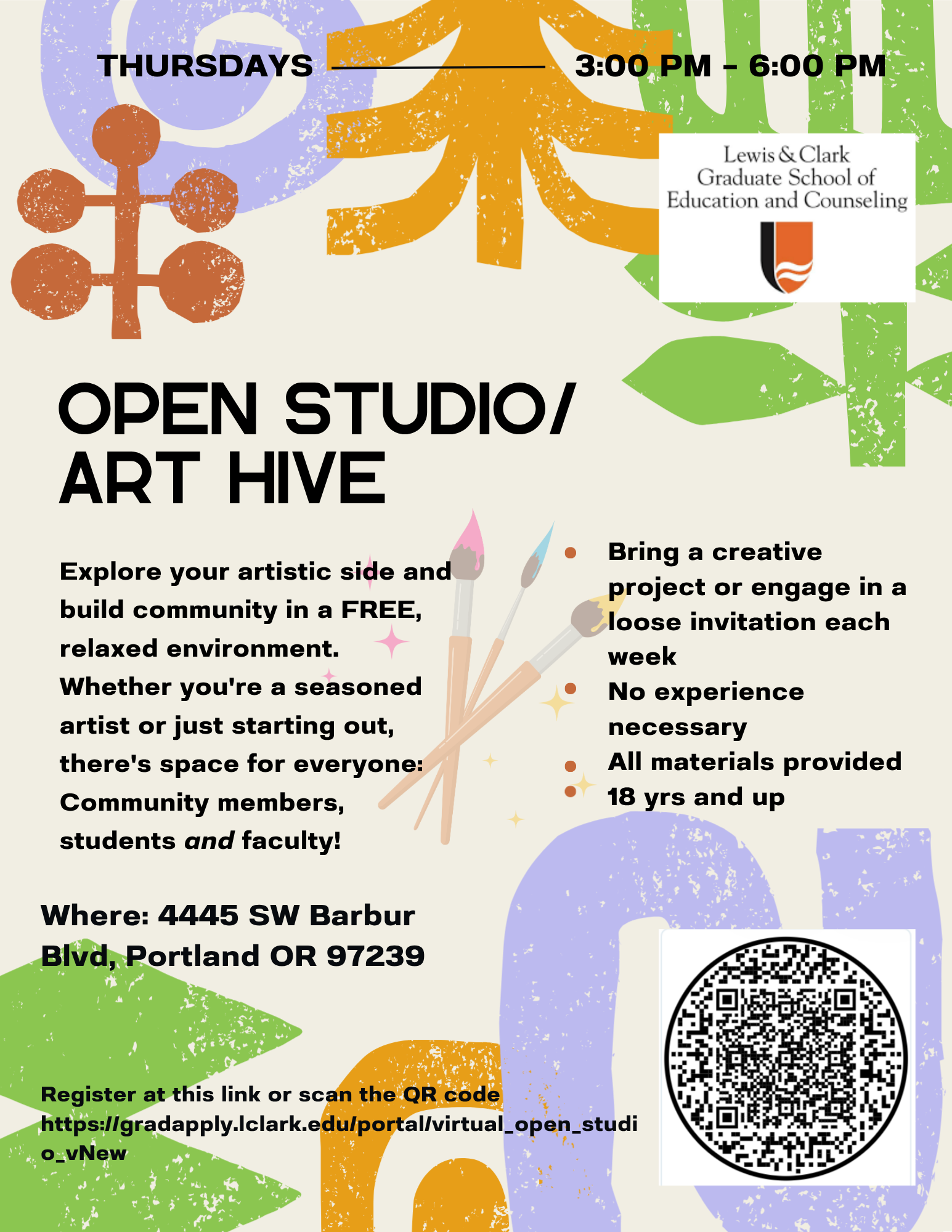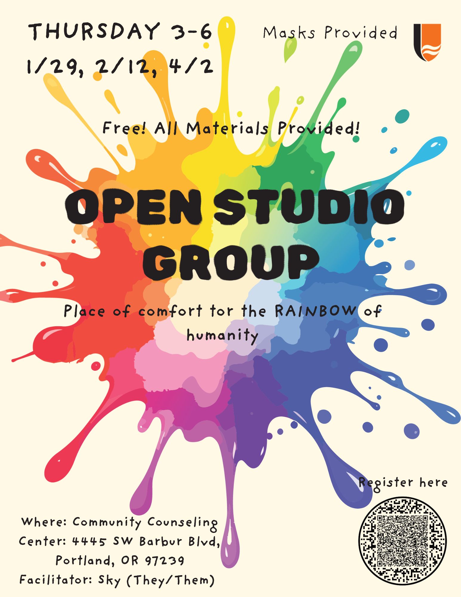 The in-person open studios are held at the Lewis & Clark Community Counseling Center, located on 4445 SW Barbur Blvd.