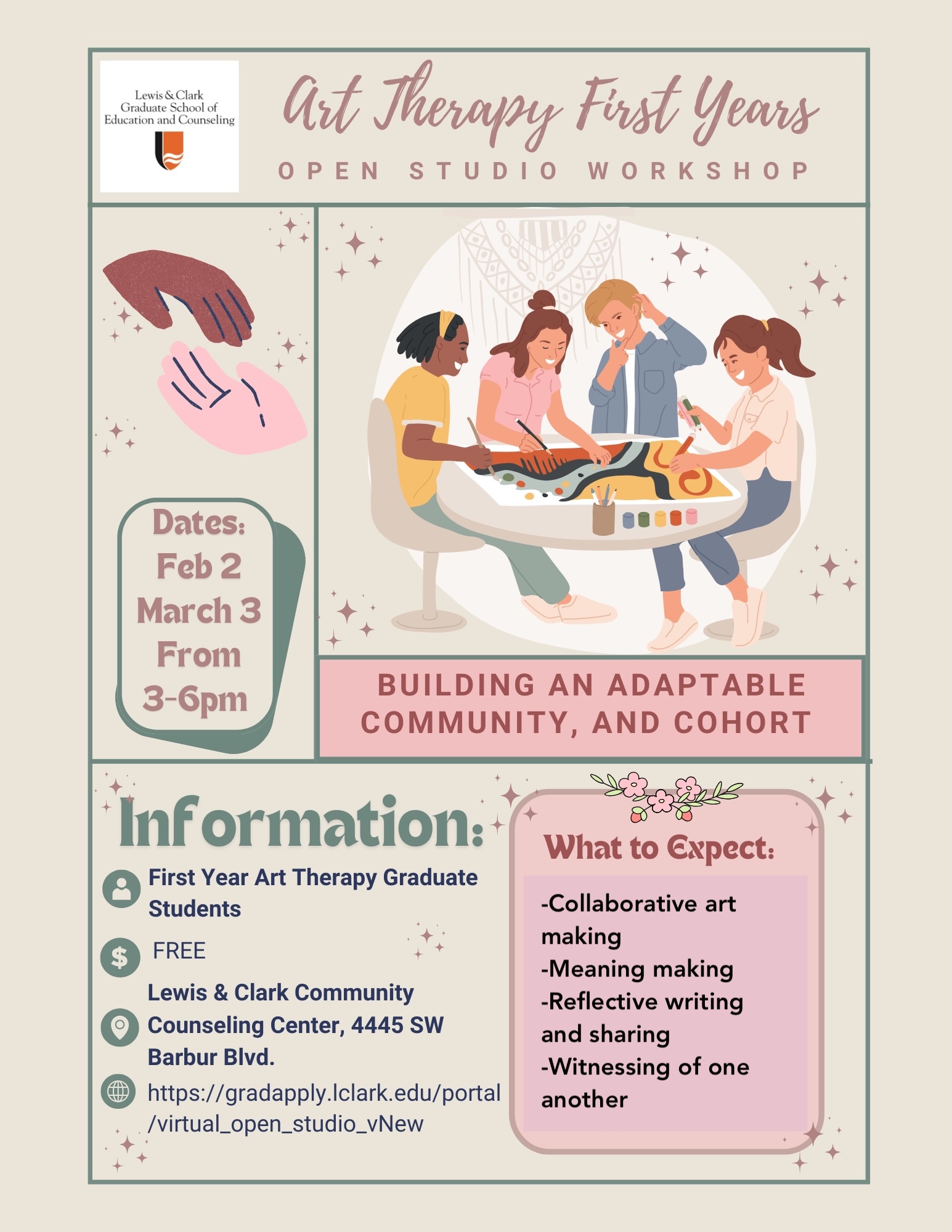 What: Student-only monthly open studio sessions for students enrolled in the any of the L&C Counseling programs. A place to create art and be in community. NO art experience necessary and materials are provided.