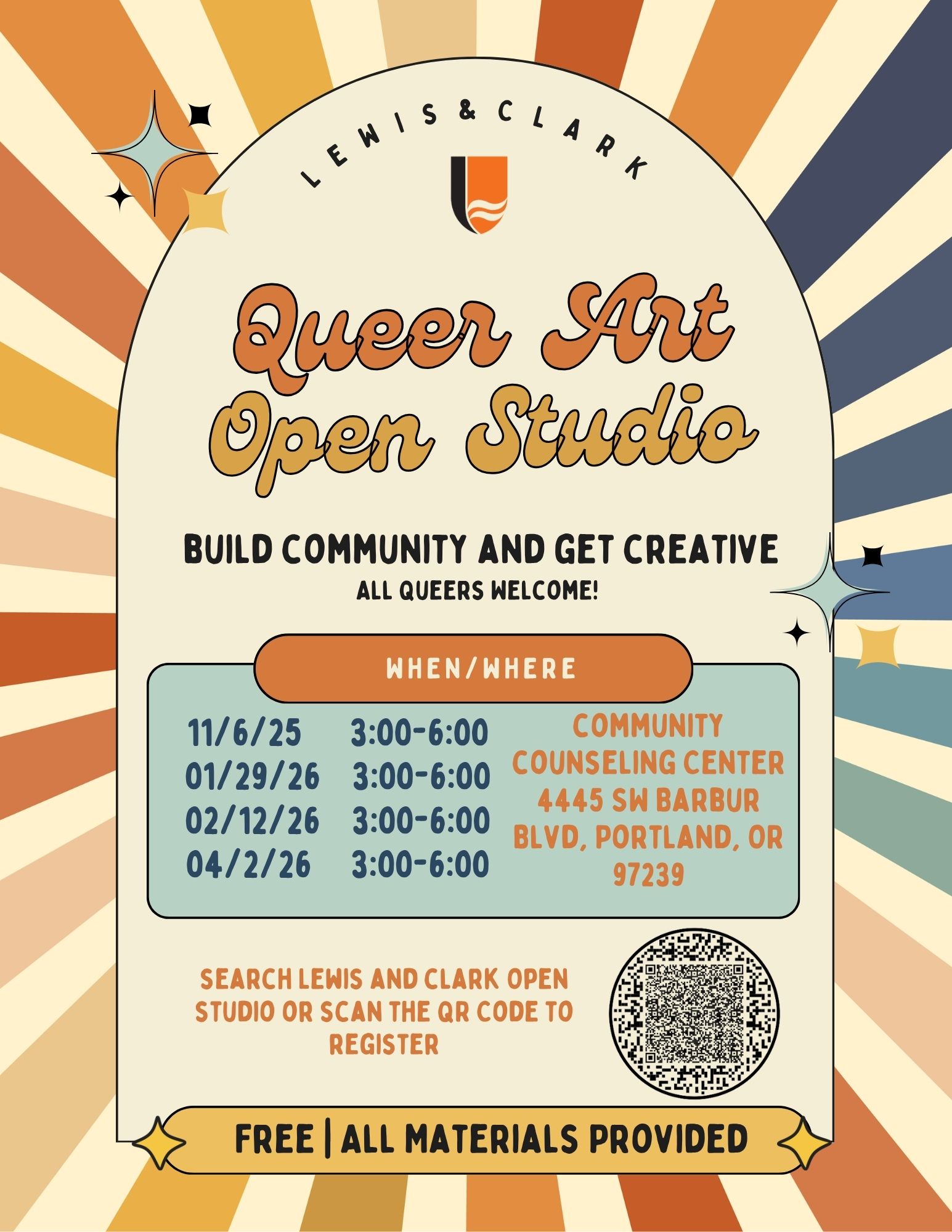 What: Student-only monthly open studio sessions for students enrolled in the any of the L&C Counseling programs. A place to create art and be in community. NO art experience necessary and materials are provided. Where: Lewis & Clark Community Counseling Center, 4445 SW Barbur Blvd. When: Thursdays from 3:00-6:00pm throughout the school year: